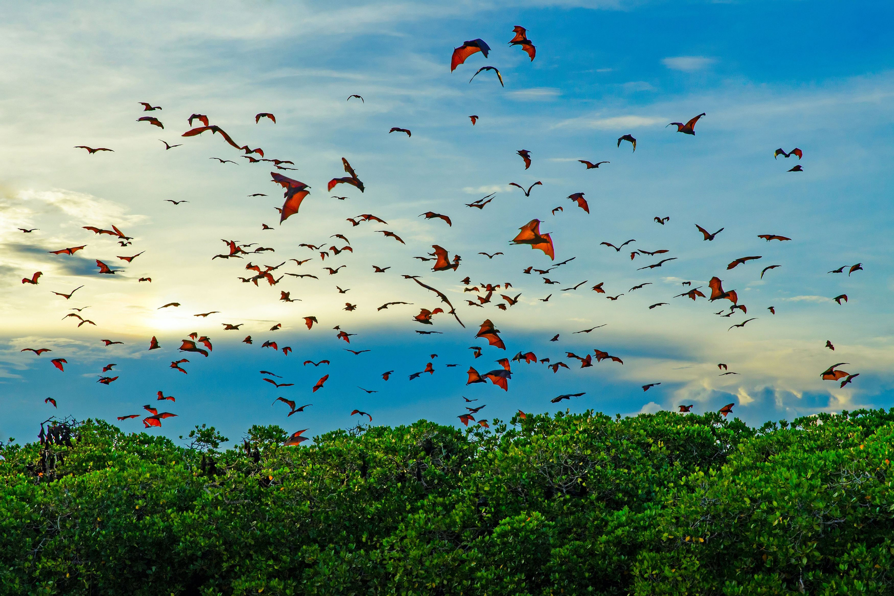 At the end of the day — sunset on Kalong Island: the sky slowly turns golden-pink, and at dusk flying foxes appear above the island, taking flight into the night.