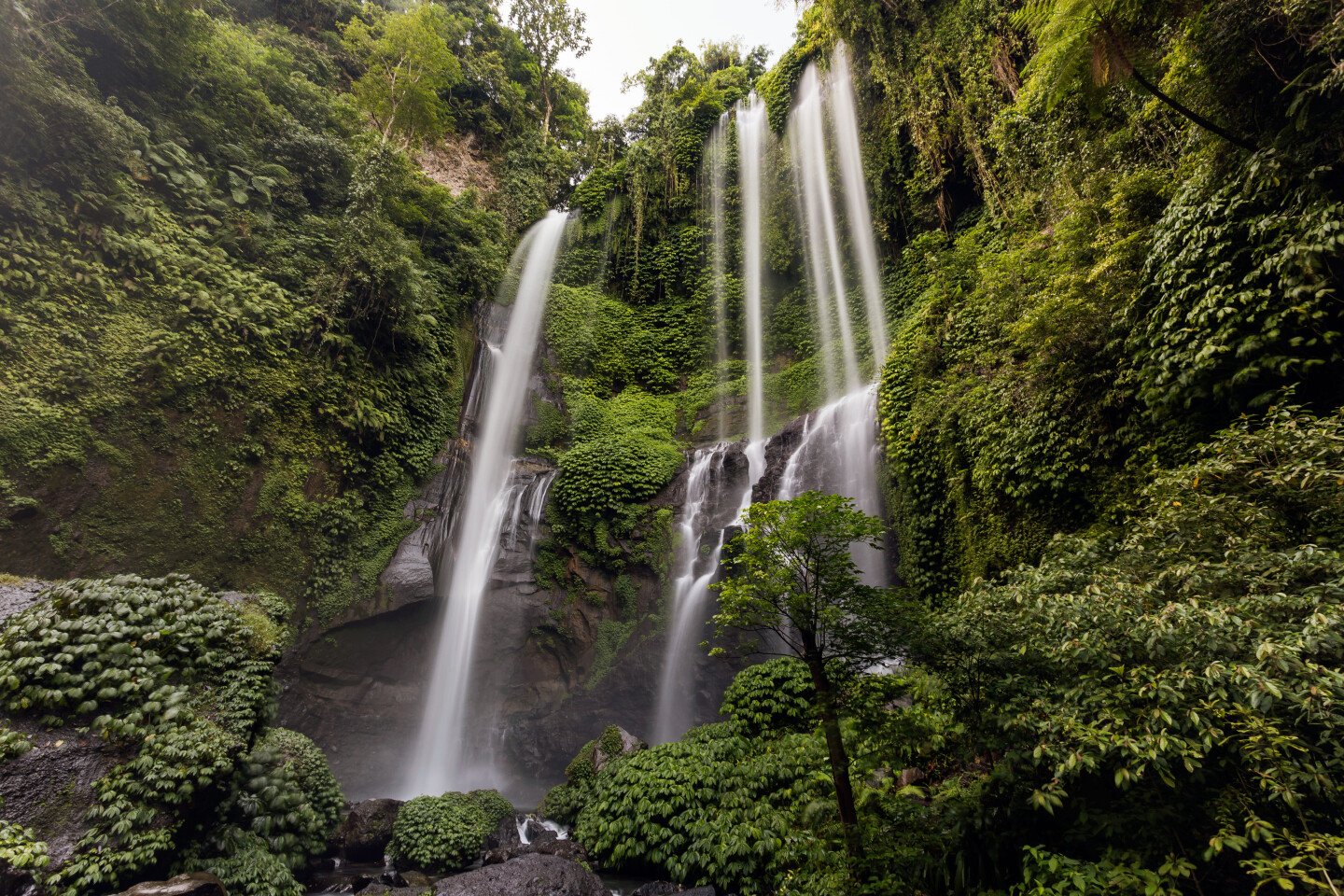 It is often called the King of Waterfalls for its impressive height and stunning natural beauty. In fact, Sekumpul is not one, but a group of seven waterfalls cascading down sheer cliffs surrounded by dense jungle. The journey to Sekumpul is a bit of an adventure: you need to descend steep stairs and wade through several streams, but the effort is well worth the view—a torrent of water cascading from a height of over 80 meters, scattering into millions of splashes against the backdrop of green slopes. The air here is cool and rich with moisture, and nature remains virtually untouched. This place is also prized for its spiritual atmosphere: locals believe the waterfalls have purifying powers. It's an ideal spot for solitude, meditation, or simply inspiration.