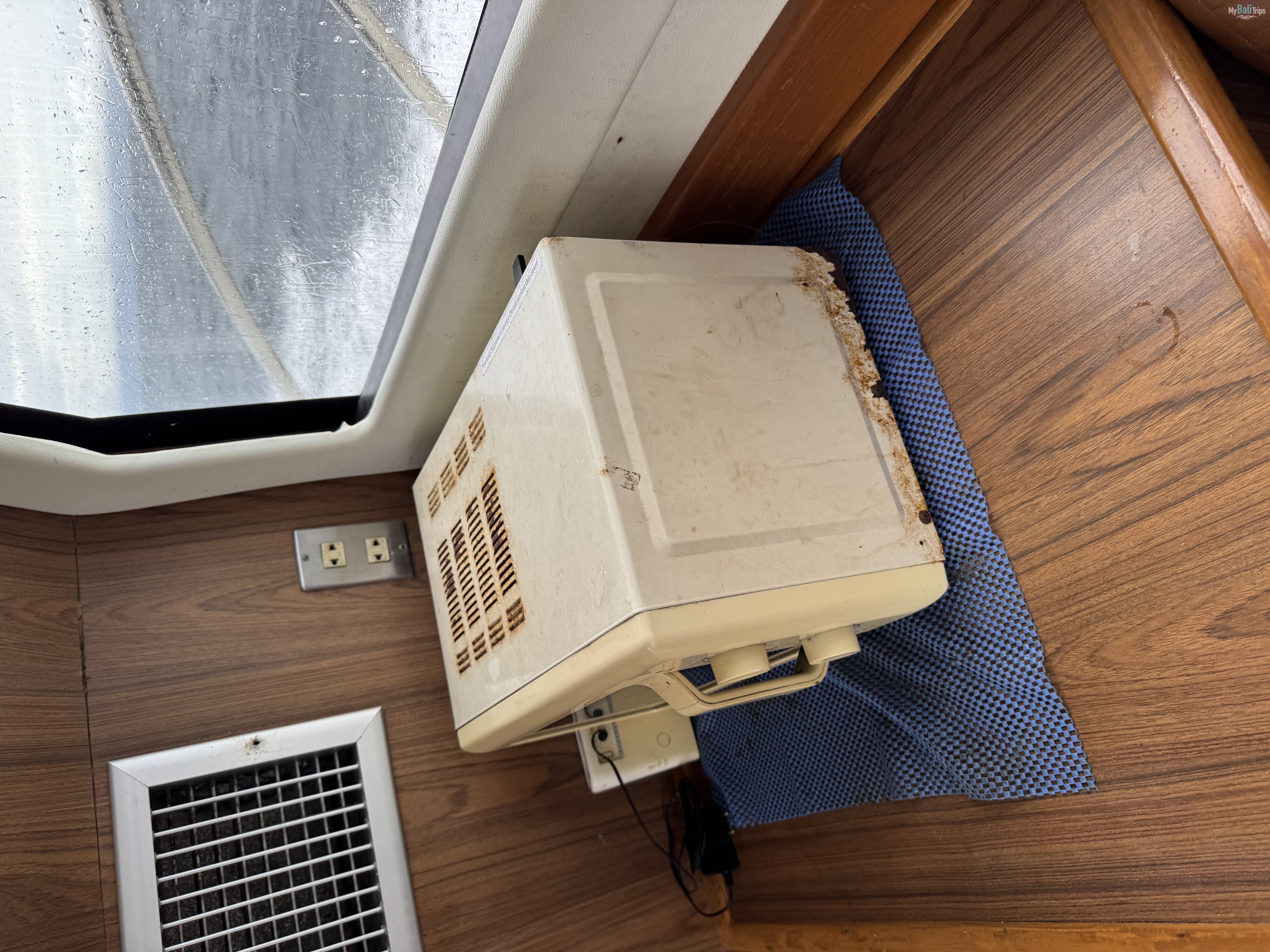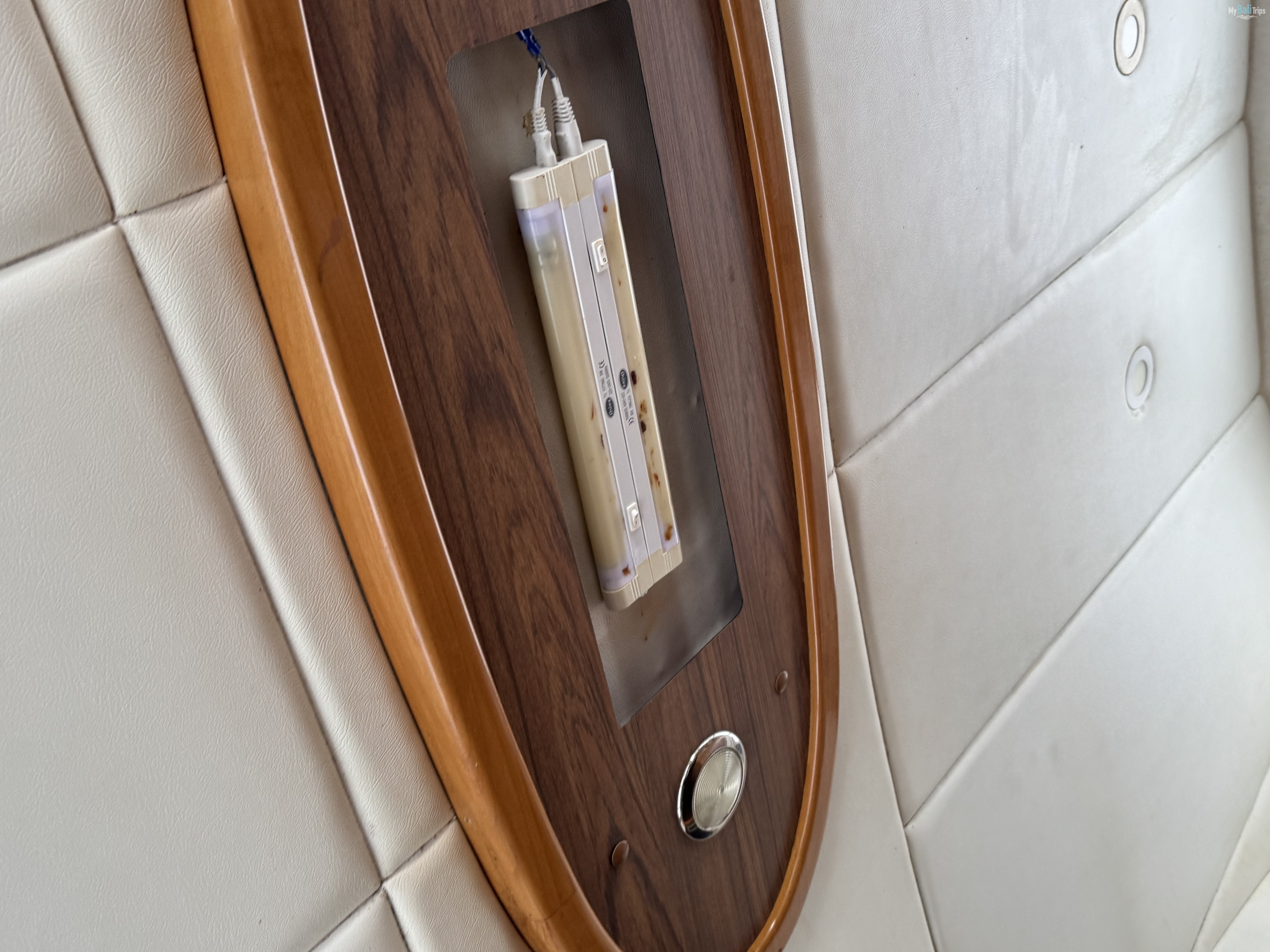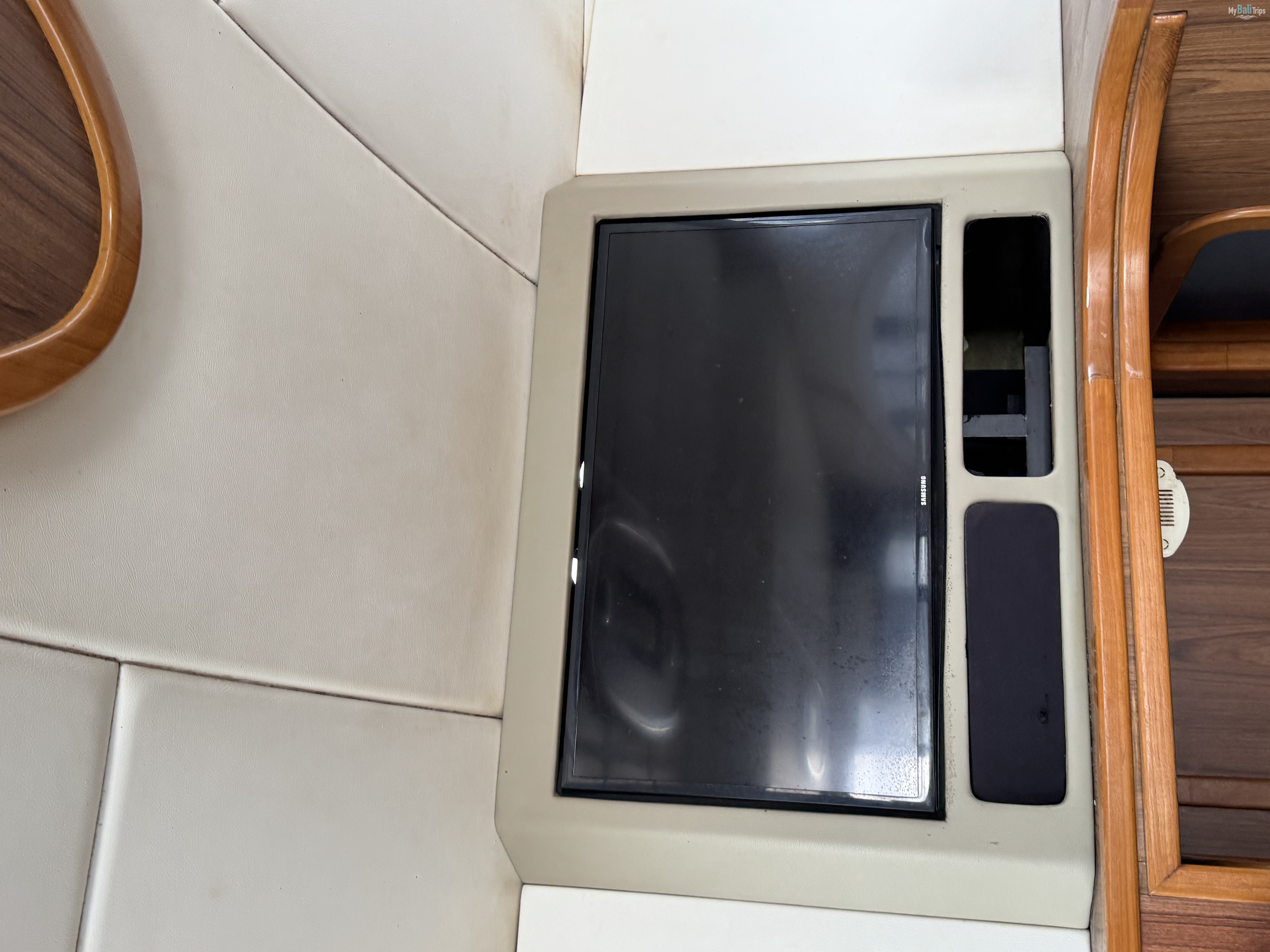 The lower deck luxurious salon with soft sofas and air conditioning, is specially designed for sparky parties or for sipping ice cold champagne among the spectacular views of the rocky shores of Nusa Penida and Lembongan Island.