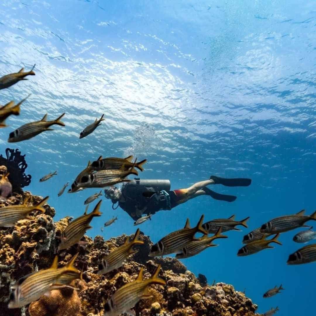 L’une des raisons pour lesquelles Blue Lagoon est un site de plongée aussi exceptionnel est son accessibilité. Le lagon se trouve à seulement quelques minutes de bateau du rivage, ce qui le rend facile d’accès et parfait pour les débutants comme pour les plongeurs confirmés. De plus, le site est à l’abri des courants, ce qui signifie que les conditions de plongée sont généralement calmes et prévisibles. Le paysage sous-marin de Blue Lagoon est d’une beauté à couper le souffle, avec une combinaison de fonds sableux en pente, d’affleurements rocheux et de jardins de coraux colorés. Cette diversité de reliefs abrite une foule d’espèces marines, notamment des murènes, des seiches, des poissons-lions, des poulpes et une palette de poissons tropicaux colorés tels que les poissons-papillons, les poissons-anges et les perroquets.