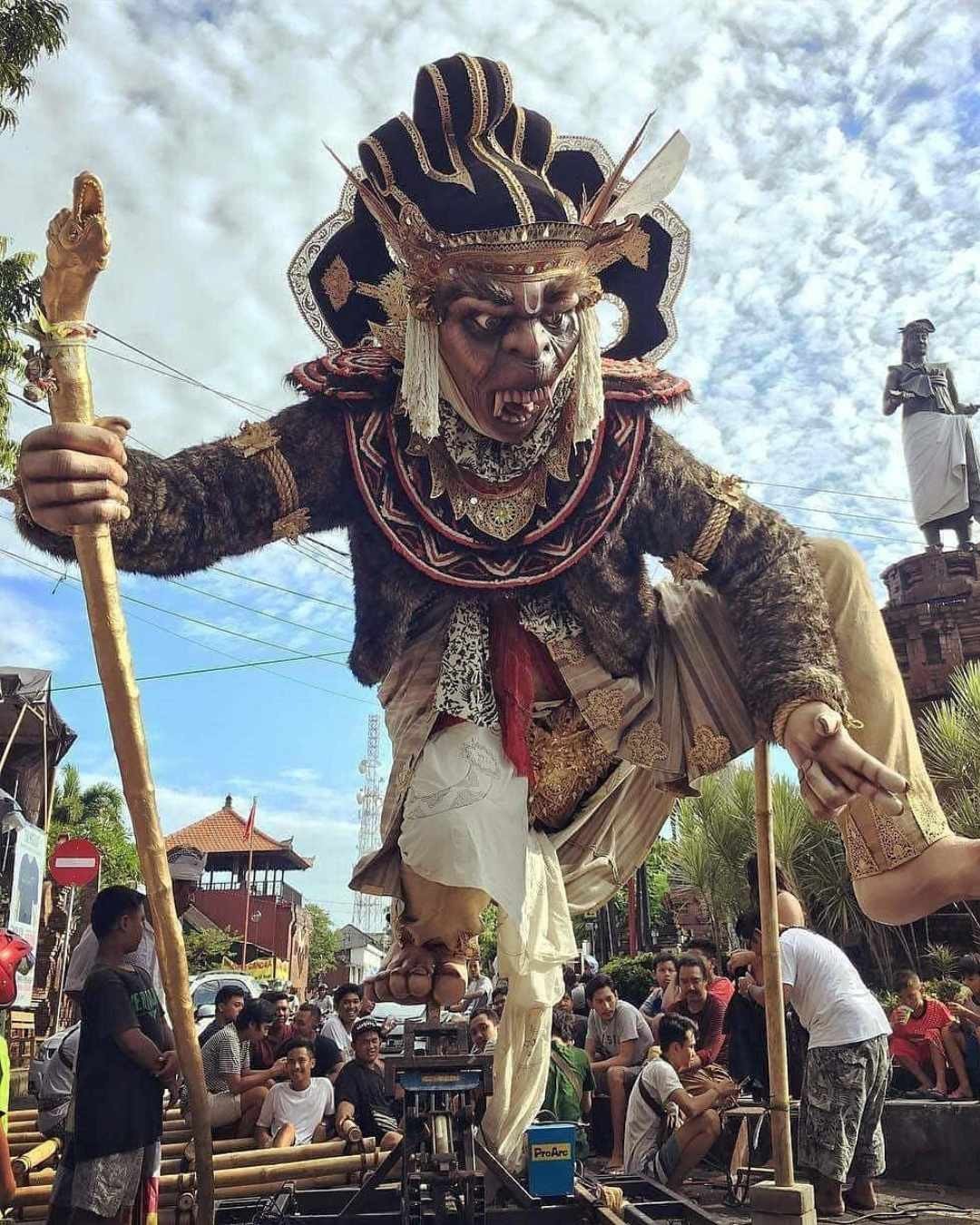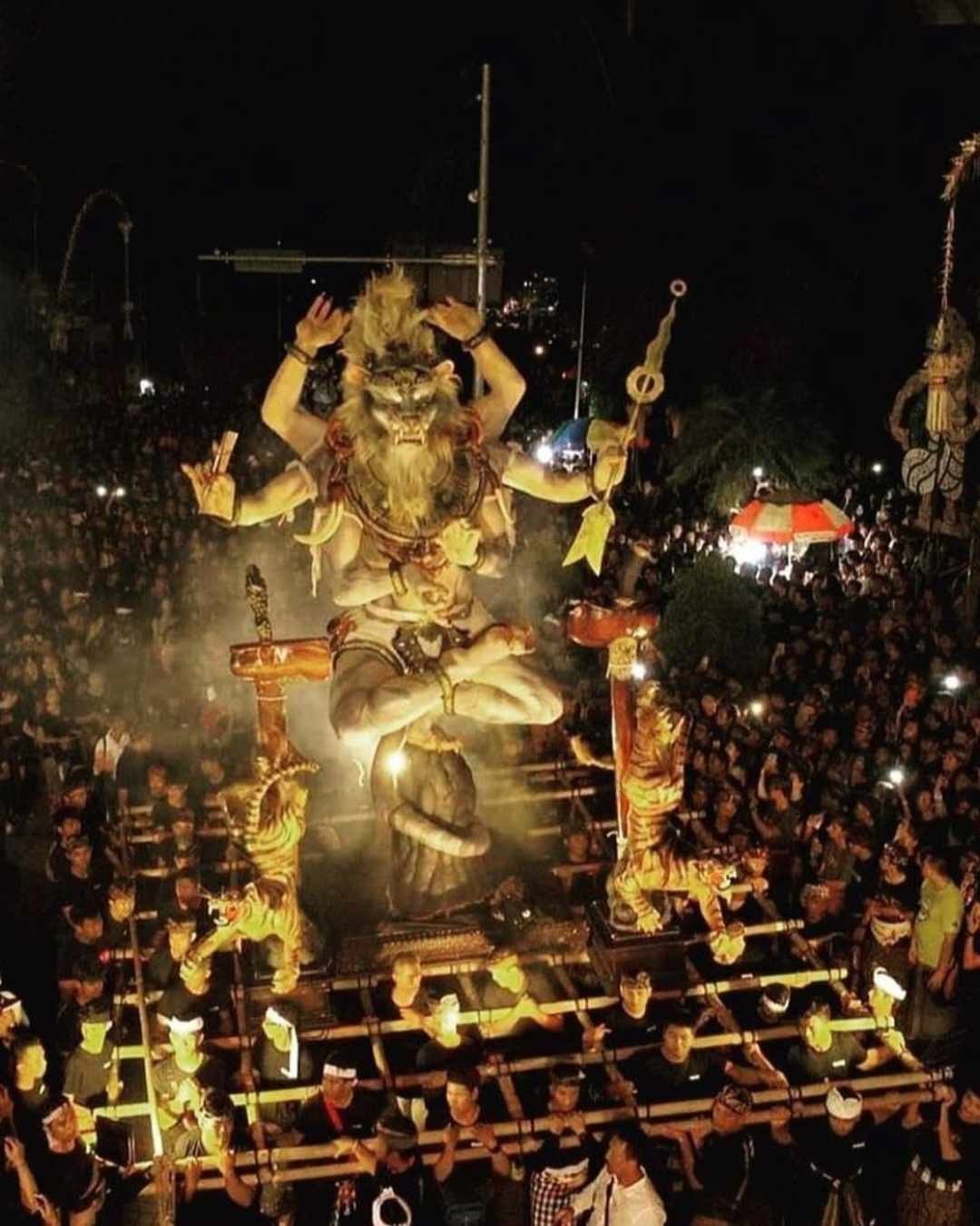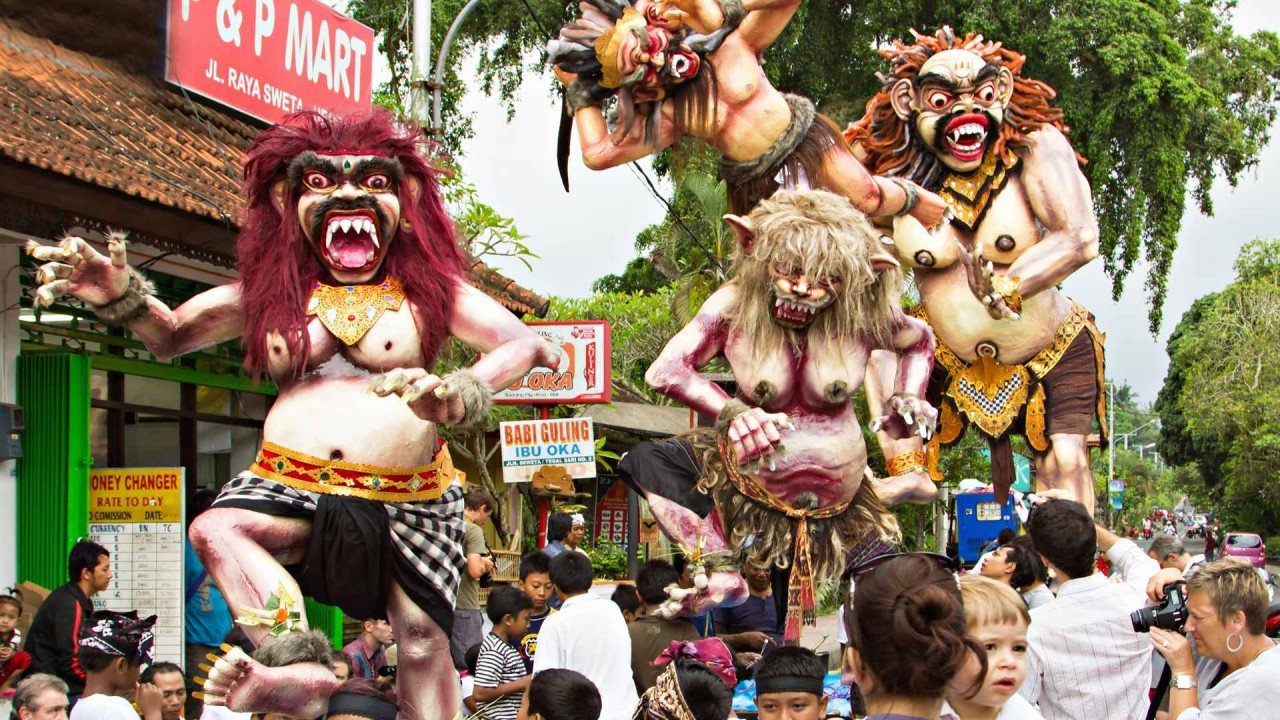 Le soir de ce même jour commence un défilé haut en couleur appelé Ogoh-Ogoh. Dans chaque ville et chaque village, les Balinais portent dans les rues d’énormes figures de démons en papier-mâché. C’est un spectacle très intéressant et coloré. Des Balinais créatifs travaillent plusieurs semaines pour créer ces monstres, qui sont réellement d’une taille impressionnante, et certains bougent même et s’illuminent. Au son de la musique traditionnelle et des tambours, éclairés par des torches enflammées et accompagnés de danseurs balinais, des hommes portent des estrades avec d’immenses statues représentant des esprits malins. Aux carrefours, ils font tourner les démons trois fois pour égarer les mauvais esprits. Partout, les torches brûlent et le vacarme gronde ; on croit qu’ils empêcheront les mauvais esprits d’entrer dans les maisons balinaises purifiées du mal.