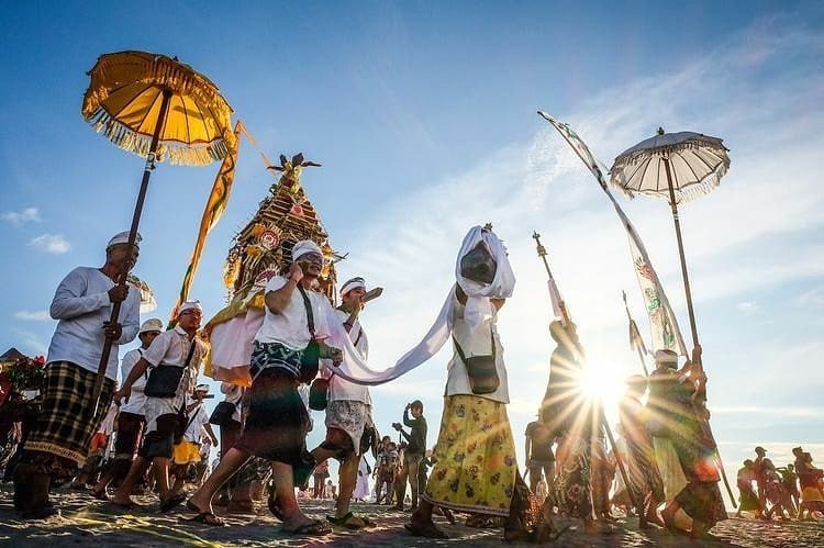 Au son de la musique traditionnelle, ils défilent en grande foule avec des penjors (de somptueux mâts en bambou) et des ombrelles balinaises, transportant des offrandes et des objets sacrés des temples pour être bénis dans l’eau. Sur le rivage de l’océan, ils prient, recueillent de l’eau de mer et de l’eau de sources sacrées, s’aspergent d’eau et jettent dans l’océan des offrandes destinées aux dieux.