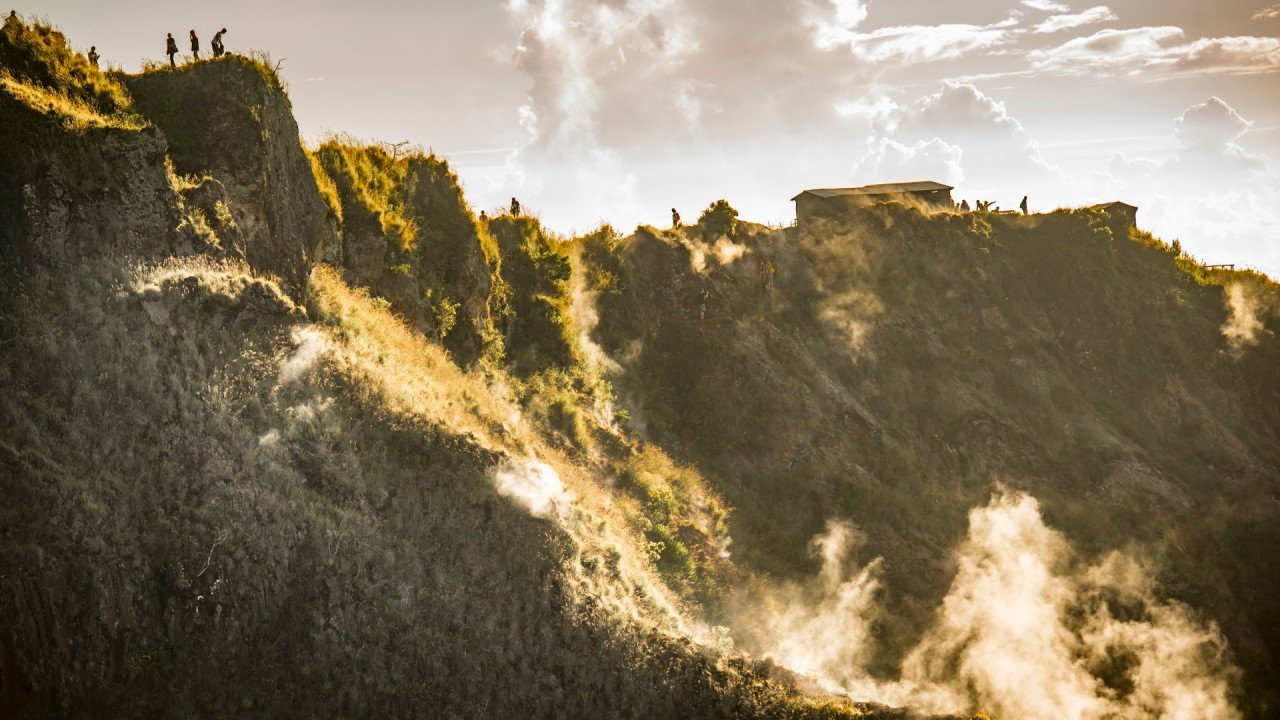 Au sommet, les randonneurs peuvent profiter de vues spectaculaires sur les paysages environnants et le lac de la caldeira voisine.