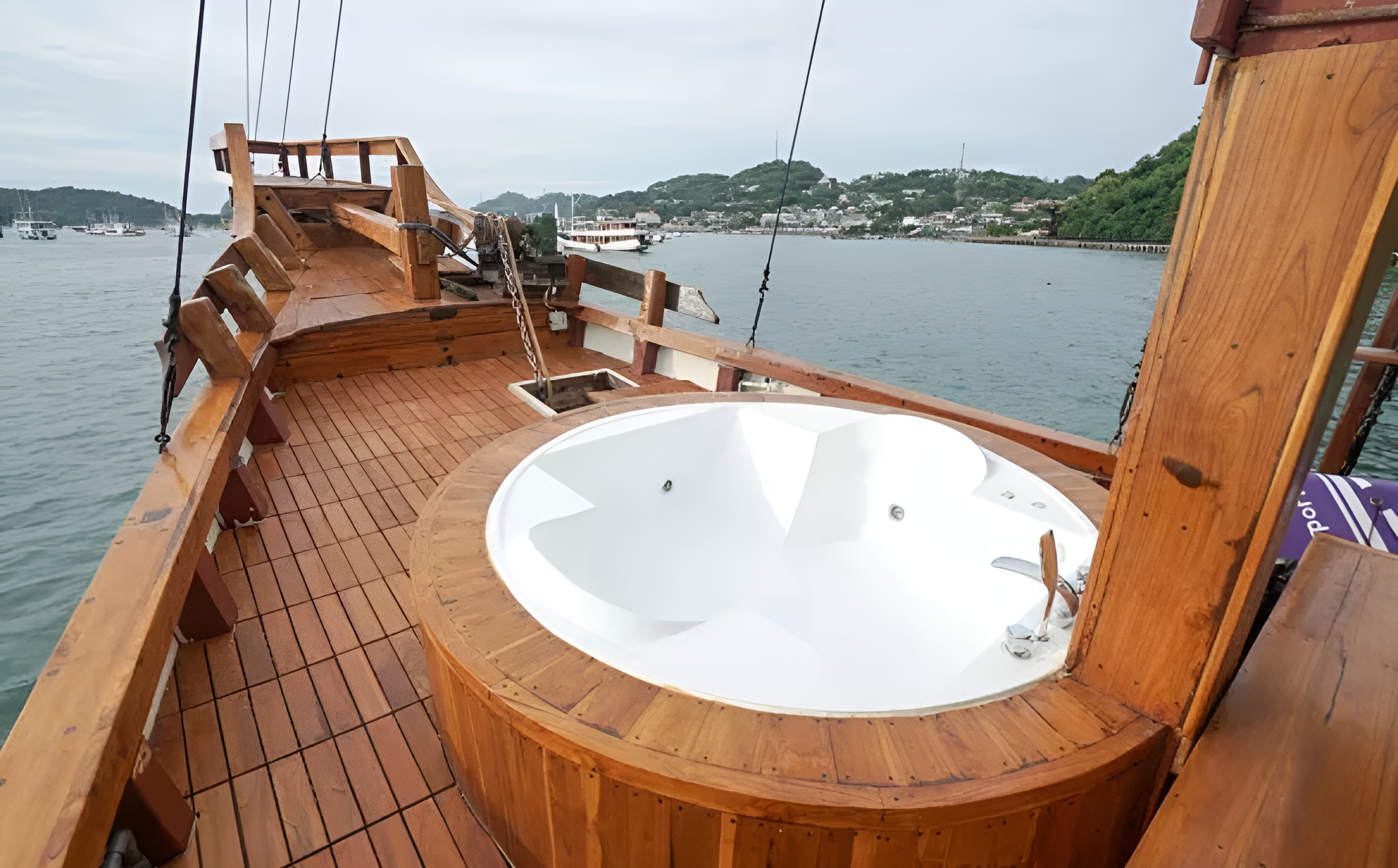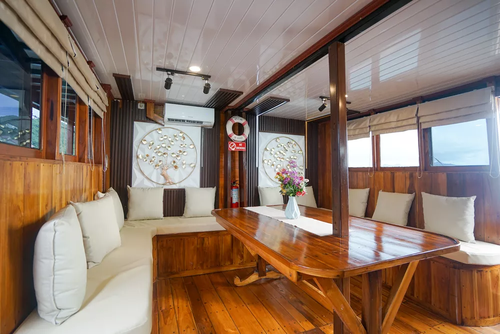 À bord, vous trouverez tout ce dont vous avez besoin pour un séjour confortable : des cabines avec douches chaudes et jacuzzis, un espace de détente à ciel ouvert pour prendre le soleil, une salle à manger extérieure où la cuisine locale sera servie, et un salon avec une télévision et du karaoké. Vous pourrez également préparer des légumes et de la viande, car du matériel de barbecue sera fourni.