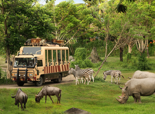 Непосредственно сафари проводится на специально оборудованном транспорте: туристов возят в закрытых стеклом или специальными решетками трамвайчиках или автомобилях. Прогулка по природной среде обитания животных длится около часа.